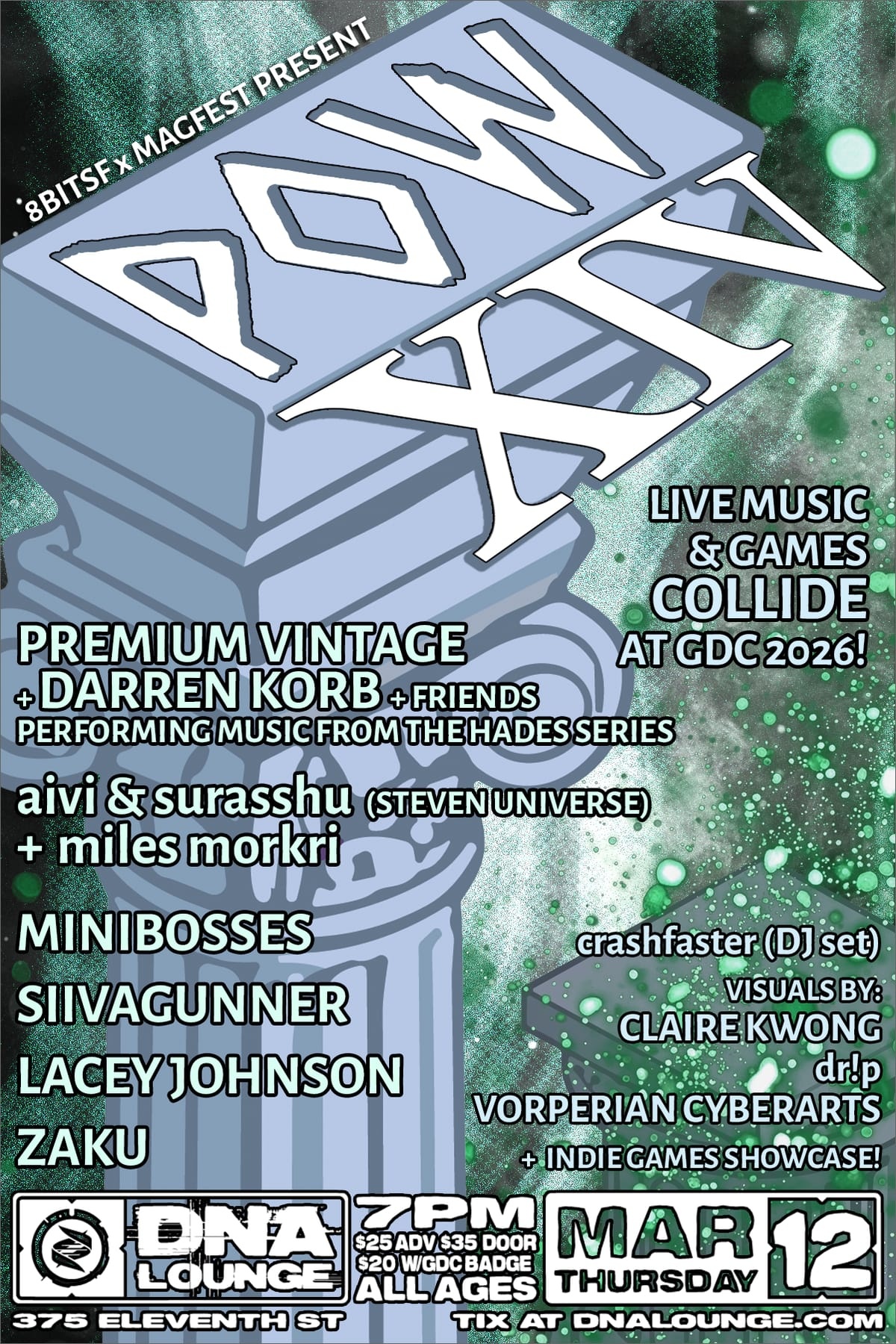 Performing Live: PREMIUM VINTAGE + DARREN KORB and Friends (Hades) AIVI & SURASSHU (Steven Universe) MILES MORKRI MINIBOSSES SILVAGUNNER LACEY JOHNSON ZAKU With DJ: Crashfaster Visuals: Claire Kwong Dr!p Vorperian Cyberarts 8bitsf's annual GDC mega-concert POW returns for its epic FOURTEENTH year, co-presented by MAGFest! Join us for a complete sensory overload of chiptune and video-game-themed live music madness, featuring lush visuals and a celebration of indie gaming. Don't forget to check out POW XIV Bonus Round the following night - discounted two-day passes are available! Premium Vintage is bringing the heat! This trio blended orchestral finesse with prog-metal shreddage for their debut album in 2023. Since then, they've been bringing the music of Hades straight to you live! They are joined by Darren Korb (Audio Director for Supergiant Games, and composer for Hades and Hades II), and vocalists Ashley Barrett and Judy Alice Lee. Aivi & Surasshu began as internet friends, making music together from a keyboard in San Francisco and a chiptune tracker in Stockholm. 14 years later, they're married and have become an award-winning composition duo most known for their instrumental music for Steven Universe, the beloved animated series that has opened doors for LGBTQ+ representation in children's television. Their unmistakable sound combines sincere piano with energetic chiptunes into a genre-bending style that they call \"digital fusion\". Their latest album Meanwhile was released by Infloresce Records in 2023. Miles Morkri (they/them) is a composer and musician based in Minneapolis. Their music blends a minimalist foundation with jazz harmony, intricate rhythms, and emotional lyricism. Super MadNES can't make it to POW this year - but in their place, we have added Minibosses! Minibosses have been keeping it real in the VG music scene since 1999, which makes it easy to see why we all use generative AI to dye our hair. Dye our hair GREY that is! Or GRAY that is! E or A sports, it's in the geme. SiIvaGunner: \"I only upload high quality video game rips.\" Lacey Johnson is a critically acclaimed Vocalist and Multi-Instrumentalist in the video game music genre. Known for her iconic keytar and high voltage hard rock and pop covers on YouTube, Lacey specializes in bringing iconic video game music to life through live performance. ZAKU is a Philadelphia-based wind-synth-fronted instrumental band that combines 80s jazz fusion, new wave, and British heavy metal. They have been described as sounding like \"a long lost Mega Man X soundtrack\" or \"if Vangelis joined T-Square and got commissioned to make a soundtrack for TMNT IV Part II.\" crashfaster is laying down a solo DJ set featuring chiptune covers and remixes of retro pop hits! Claire Kwong connects art and technology to make people move. She creates immersive environments using projection and motion capture. Her games encourage people to move, communicate, and touch each other. Through her art, Claire aims to dramatize her own experiences and challenge personal and social boundaries. Colloquially known as Drip, she is a pixel artist, graphic designer, and tattoo artist based in Brooklyn. Previously, she has traveled throughout the country performing live visuals with animated pixel art along musicians and other artists in the chiptune and video game community. Her current ventures as a tattoo artist have allowed her to expand her travels to the UK and other states to meet with clients seeking her unique pixel art tattoo style. Her inspirations include indie games, graphic novels, food, pop surrealism, psychedelia, and technical/experimental music scenes. chiptune. video game music. progressive metal. synthwave. 7pm - 2am. all ages. With GDC Badge: $20; Gen. Adm.: $25 advance; $35 door; Two Day Pass: $35. Buy tickets: https://www.dnalounge.com/calendar/2026/03-12.html Watch and listen: Premium Vintage: Lament of Orpheus: https://youtu.be/ozvbMK6Sv7E Aivi & Surasshu: Lonely Rolling Star: https://youtu.be/fe-u40YEYcY Lacey Johnson: Clair Obscur: https://youtu.be/ll5vh8m7rwY Minibosses: https://youtu.be/eGkkfp7YACE