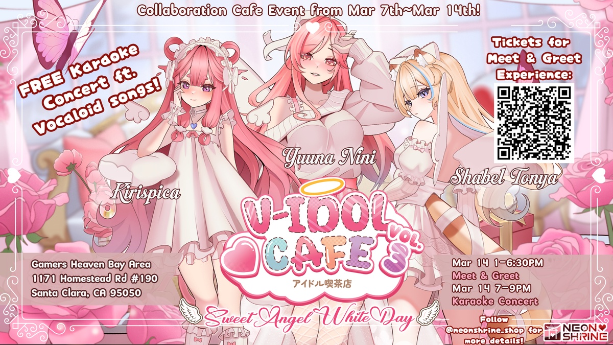 Join Vtubers Kirispica, Yuuna Nini, & Shabel Tonya for Sweet Angel White Day at Gamers Heaven Bay Area 3/7-14 with a special event day 3/14!